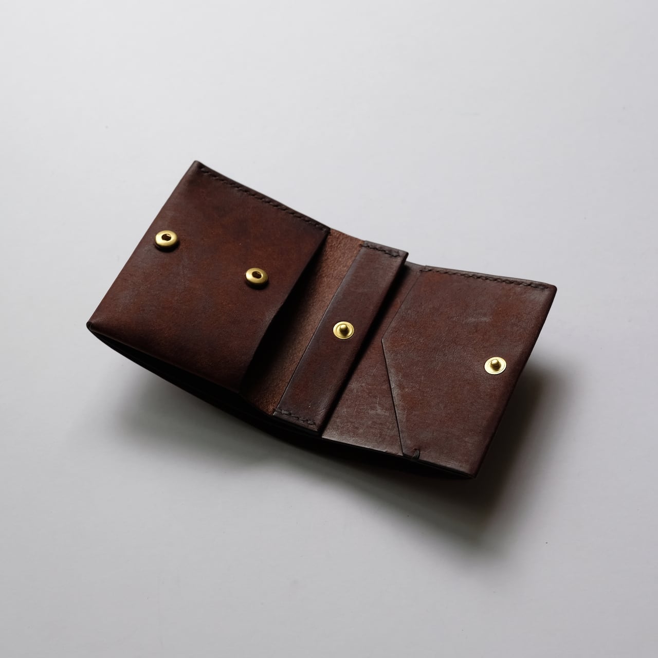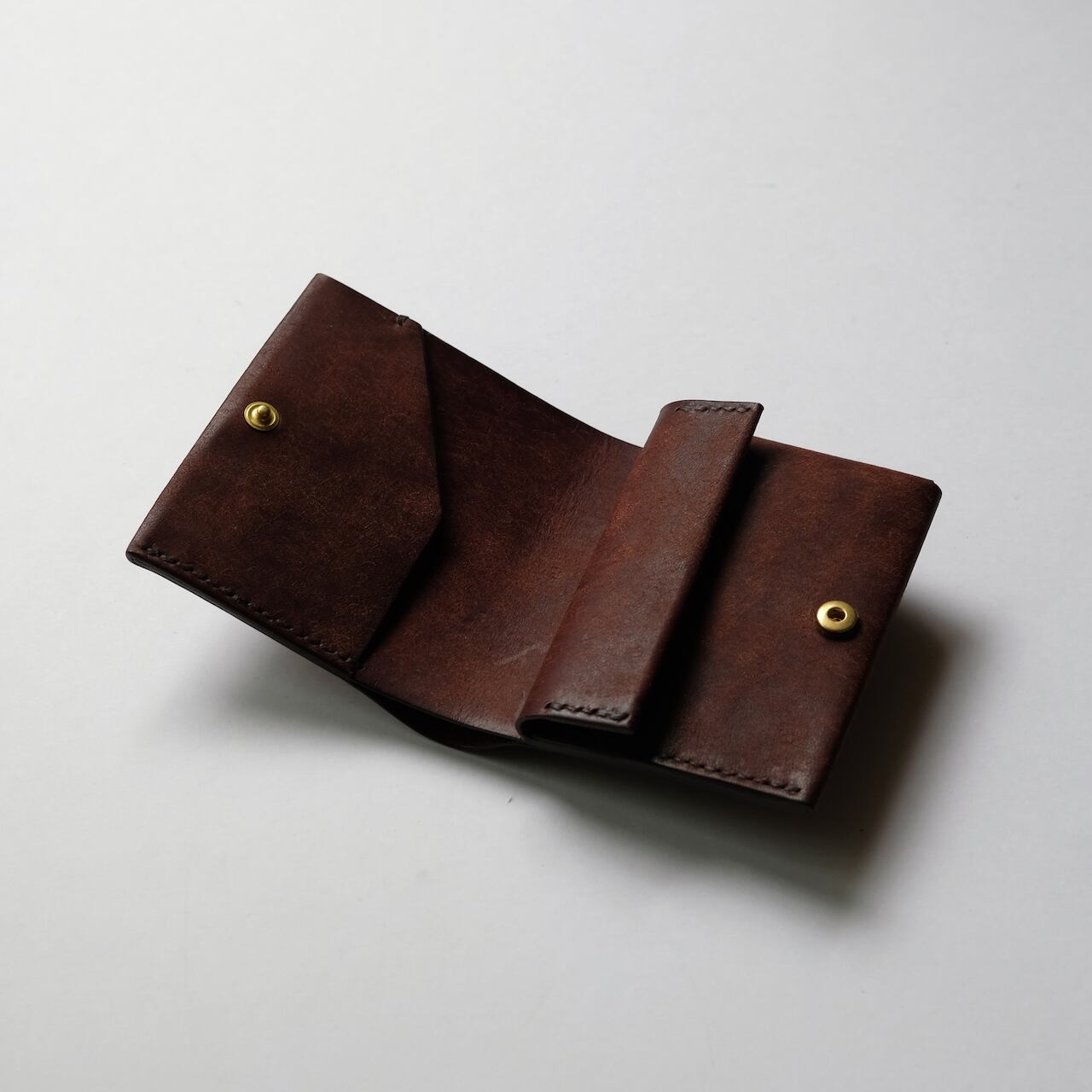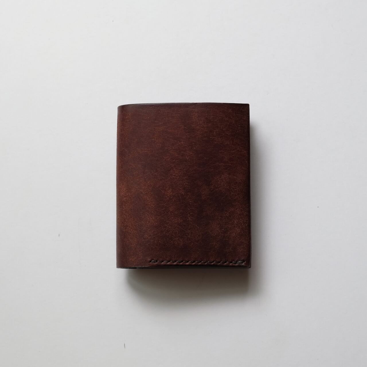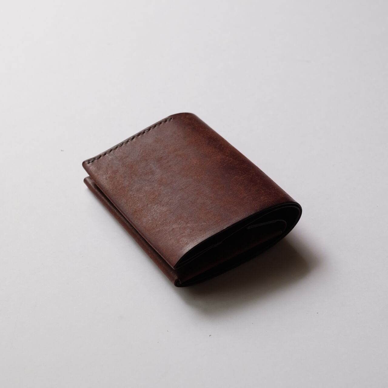 一枚の革を折り返し縫い上げた小さいな二つ折り財布。