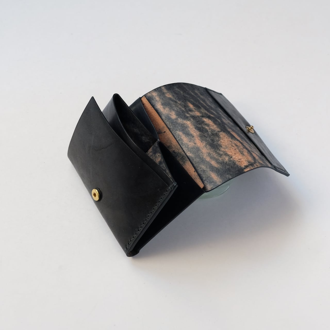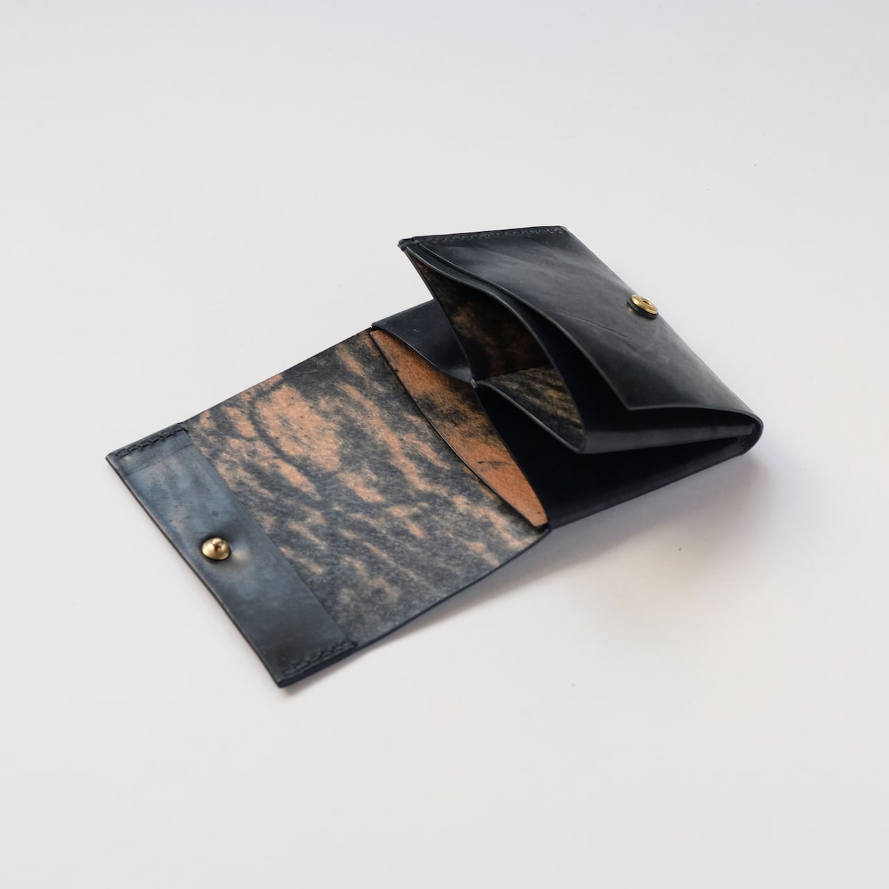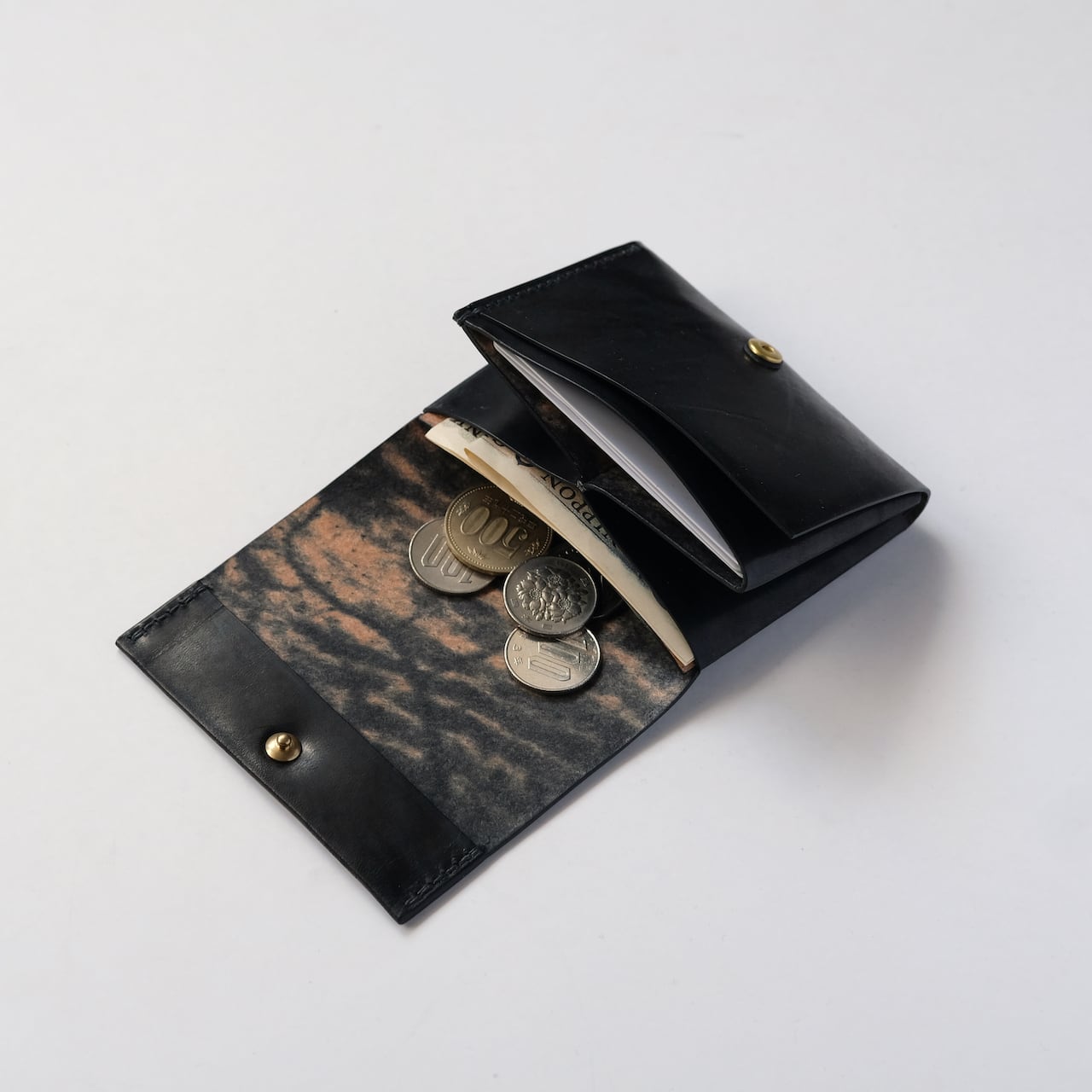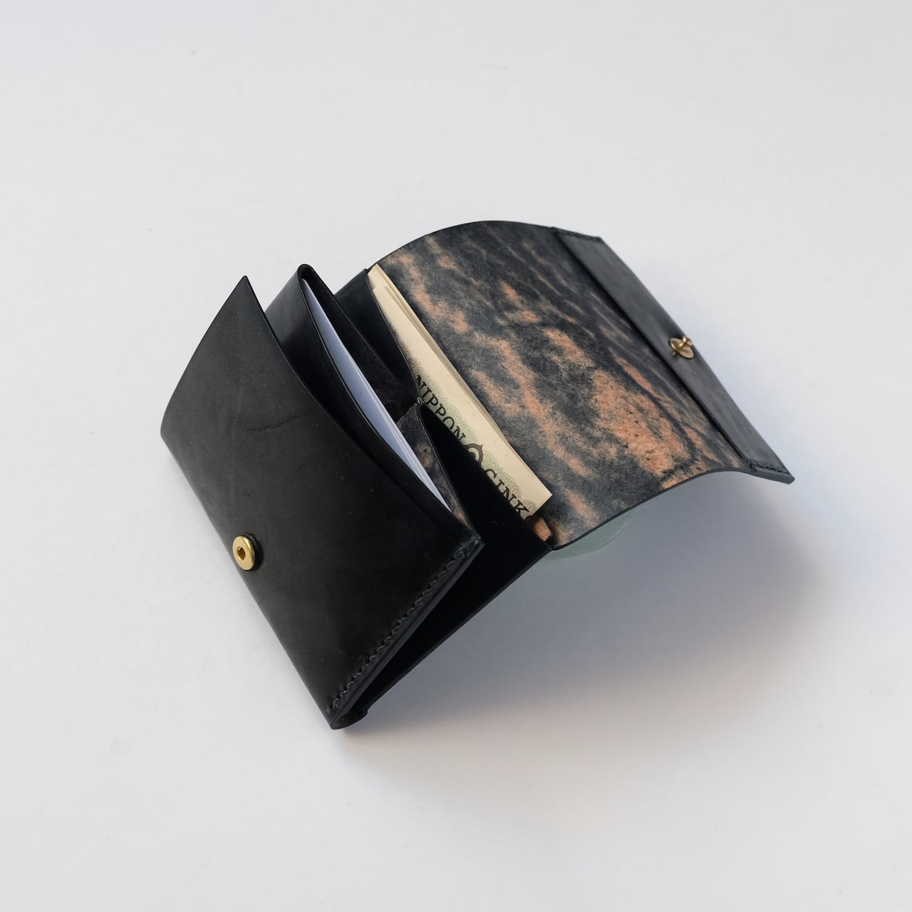 一枚の革を折り返し縫い上げた最小限を持ち歩く小さな財布。