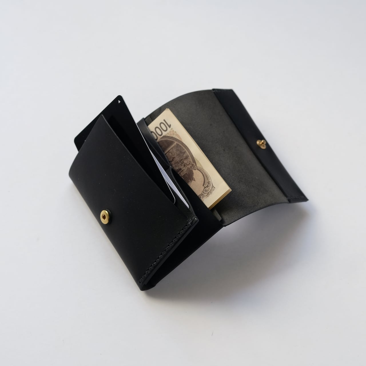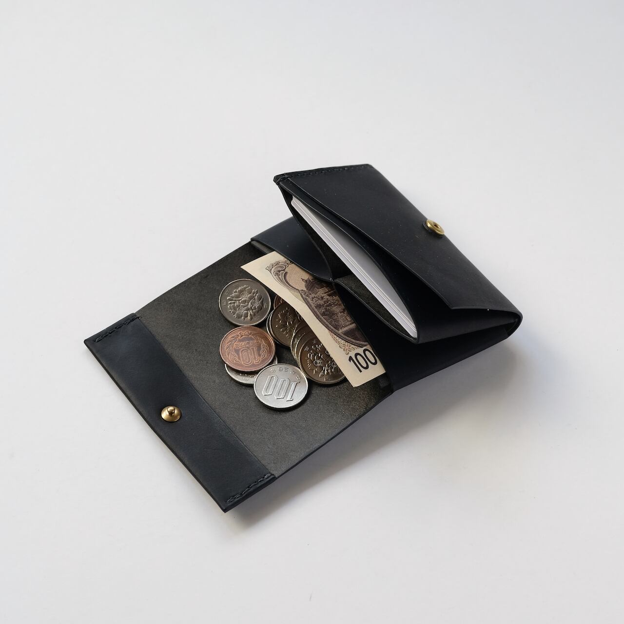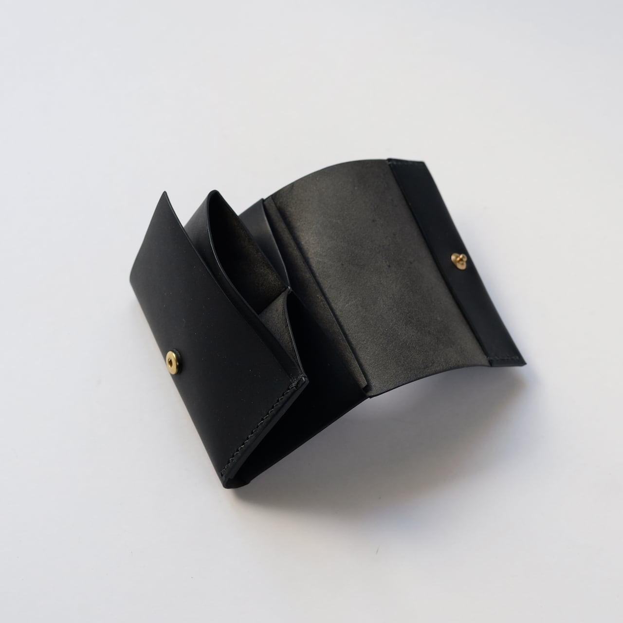 一枚の革を折り返し縫い上げた最小限を持ち歩く小さな財布。