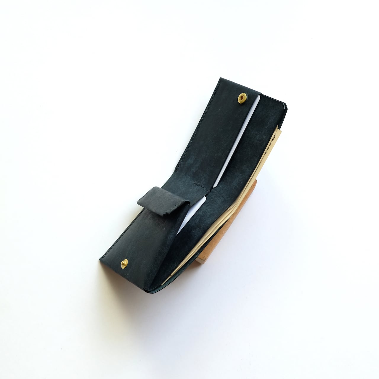 パーツを組み合わせるのではなく、切り出した一枚の革を折り製作する構造の中で革の重なる部分を出来る限り少なくし最小限の縫製で仕上げることで薄く軽くシンプルな財布へ仕上げています。