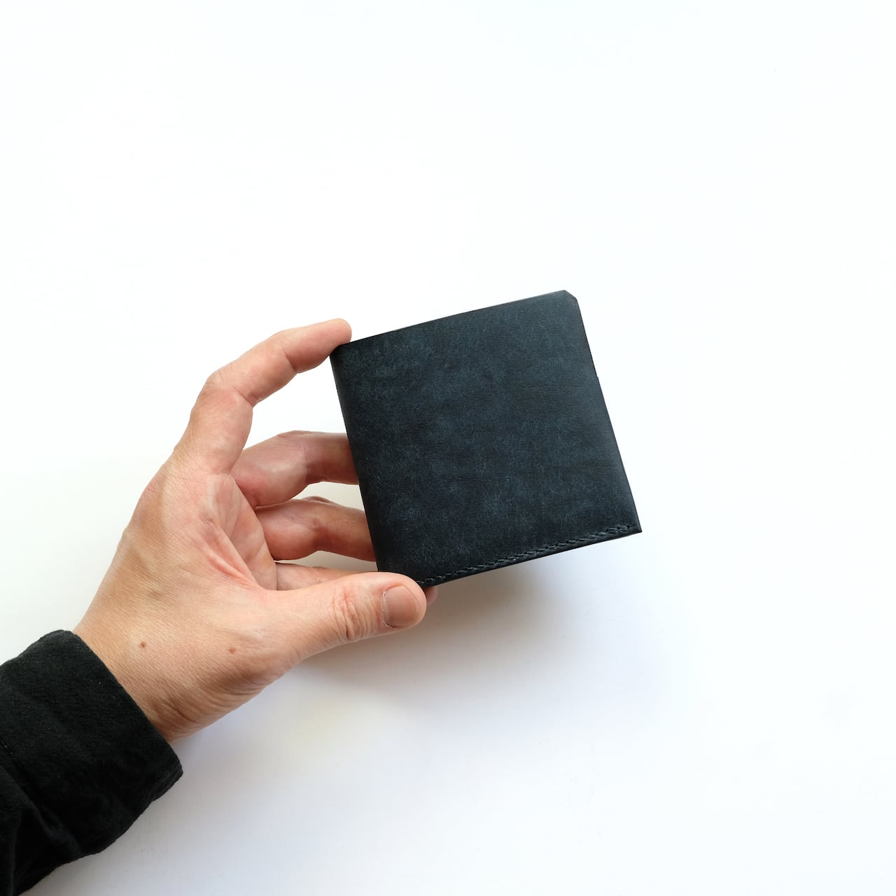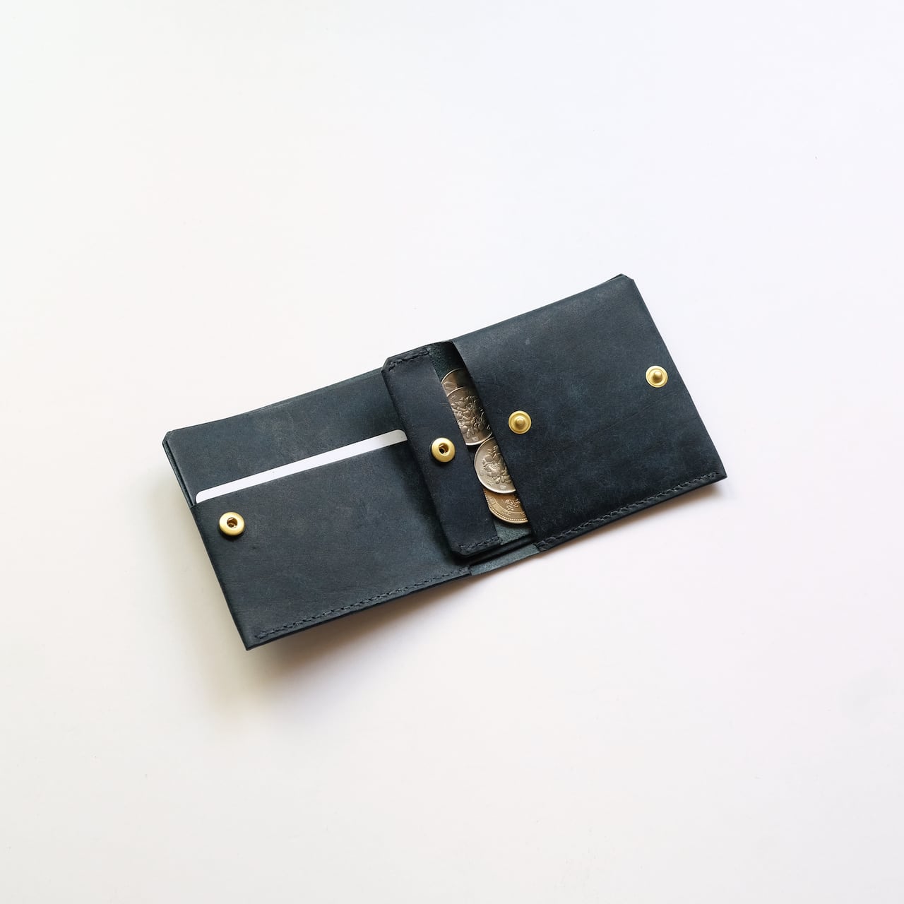 一枚の革を折り返し縫い上げた小さいな二つ折り財布。