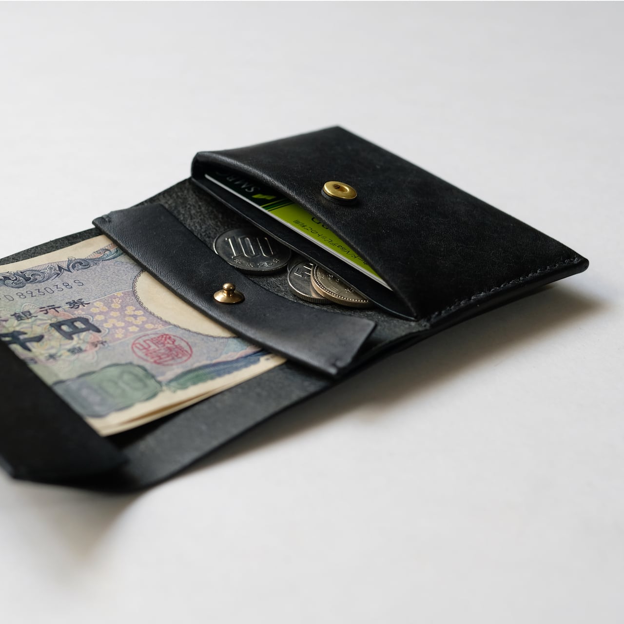 最低限必要なものだけ持ちこれひとつで出かけていただけるコンパクトなデザインで、最小限の革と縫製で薄く軽く、収まり良く手に馴染む財布です。