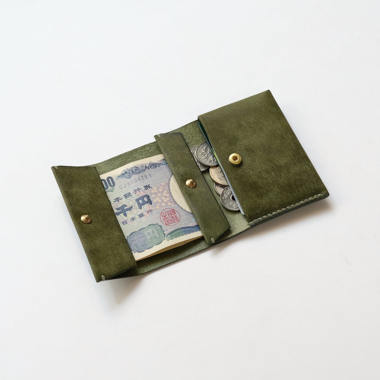 最低限必要なものだけ持ちこれひとつで出かけていただけるコンパクトなデザインで、最小限の革と縫製で薄く軽く、収まり良く手に馴染む財布です。